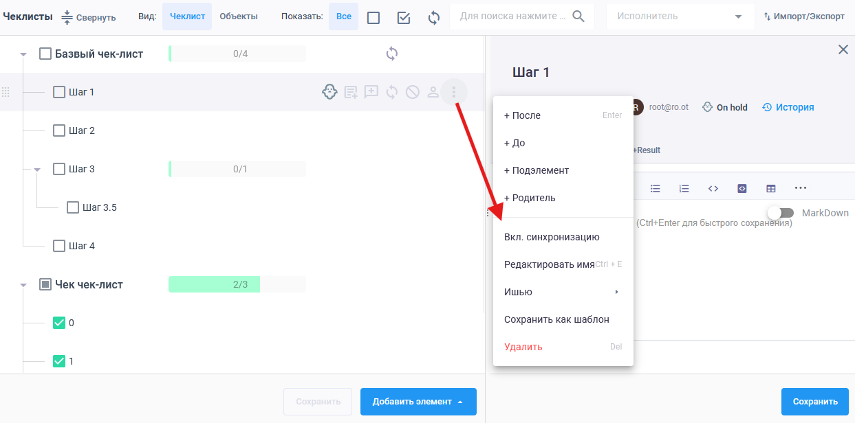 Создание чек-листов на вкладке Чеклист