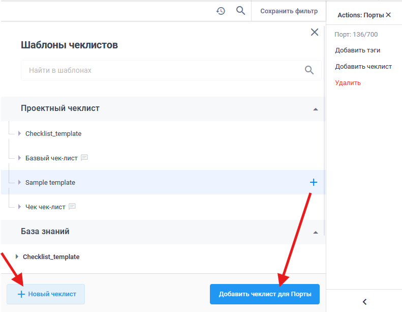 - Сохранить как шаблон — нажмите, чтобы сохранить пункт или весь чек-лист в шаблонах. Новый шаблон с указанным вами названием будет доступен на вкладке Чеклист > База знаний.