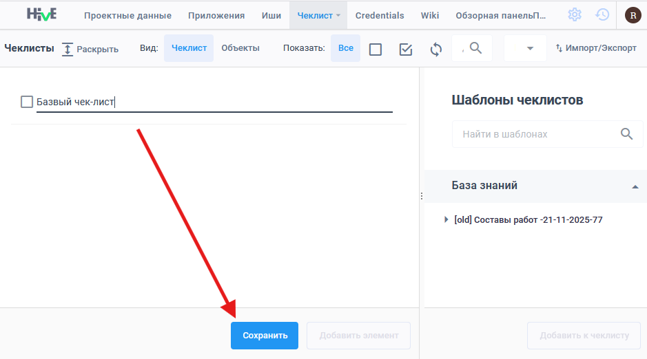 - База знаний — пользовательские шаблоны чек-листов, которые хранятся в базе данных Hive. Данные шаблоны доступны для всех проектов Hive.