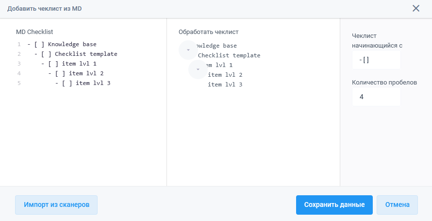 В окне Добавить чеклист из MD нажмите Импорт из сканеров или вручную введите текст в формате Markdown.