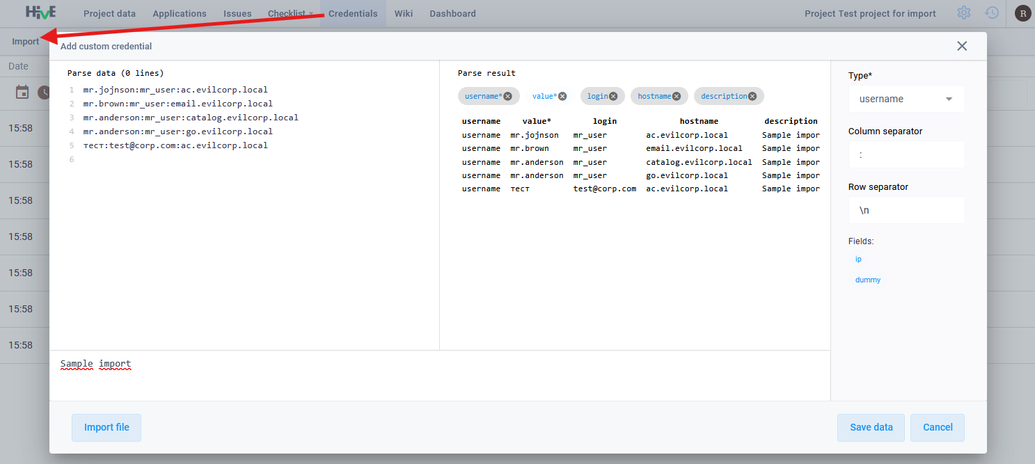 - Перейдите на вкладку Учетные данные (Credentials) и нажмите Импорт (Import). Если учетных данных в проекте еще нет, выберите опцию Import credentials.