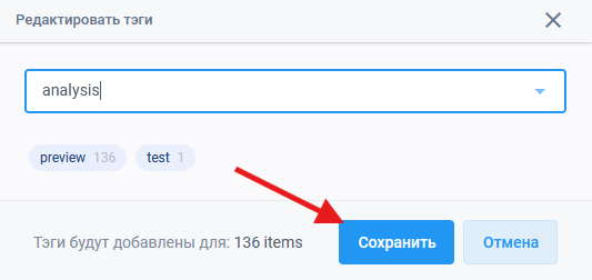 В новом окне выберите существующие теги и по желанию добавьте новые. Чтобы добавить новый тег, введите его имя и нажмите Enter. Когда выберете все нужные теги, нажмите Сохранить: