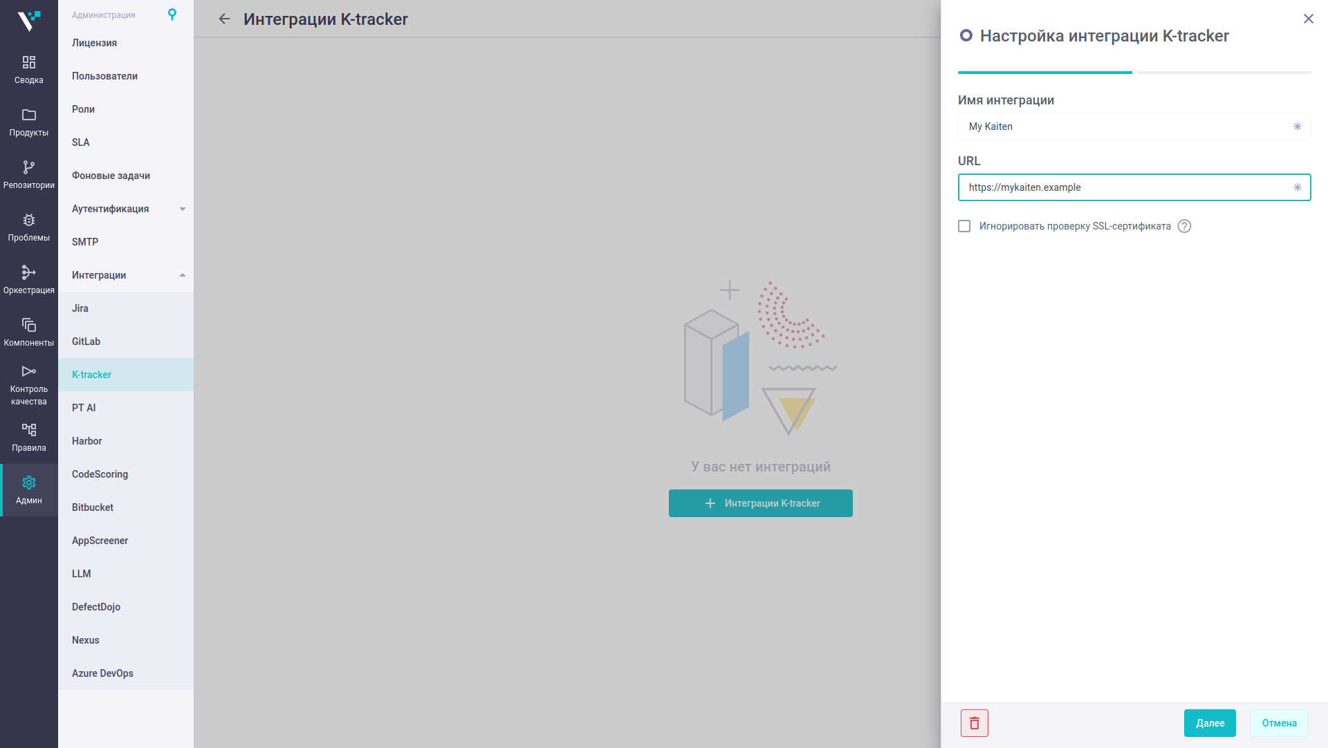 Для настройки интеграции перейдите в раздел Администратор → Интеграции → K-tracker.