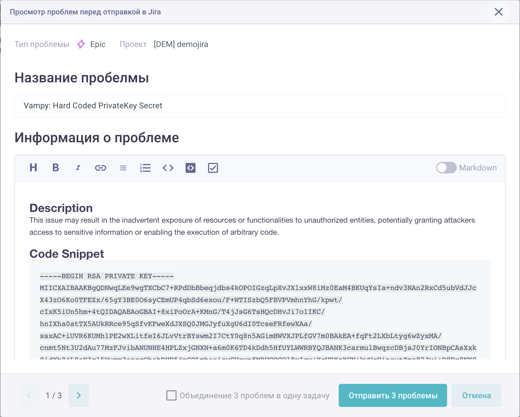 Вы можете объеденить несколько уязвимостей в одну задачу в Таск Трекере. Для этого перед отправкой уязвимостей отметьте опцию "Объединение проблем в одну задачу"