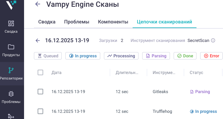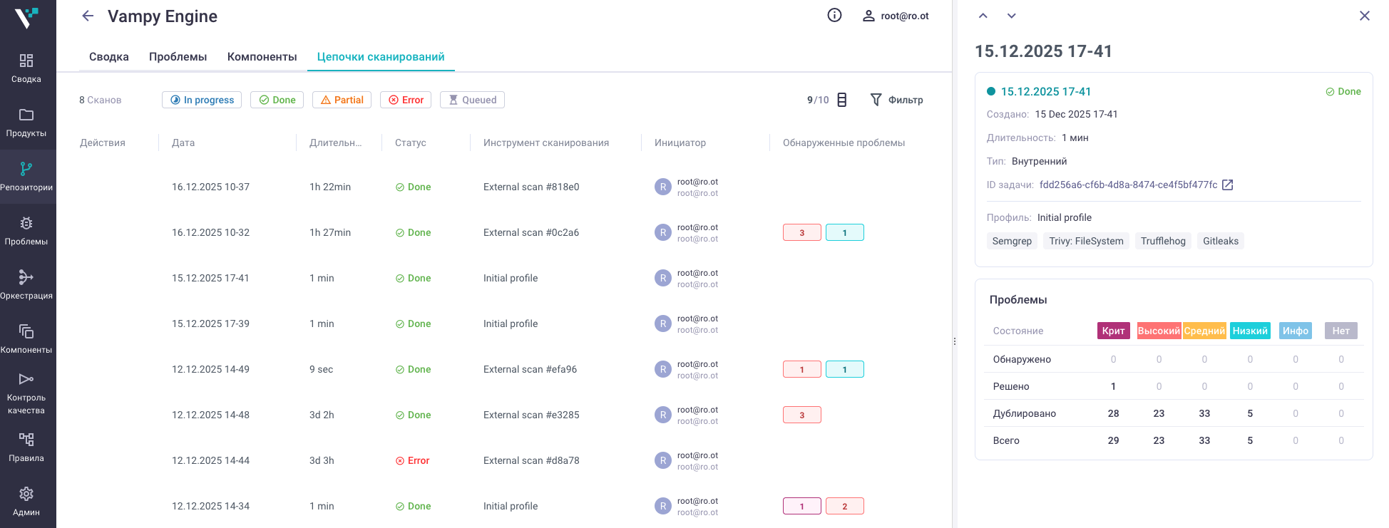 - просматривать детали запуска сканирования (когда, кем, какими сканерами, какие репозитории/продукты )