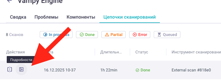 При клике на любое сканирование, отобразится детальная информация о сканировании с детализацией работы по сканерам в рамках этого сканирования.