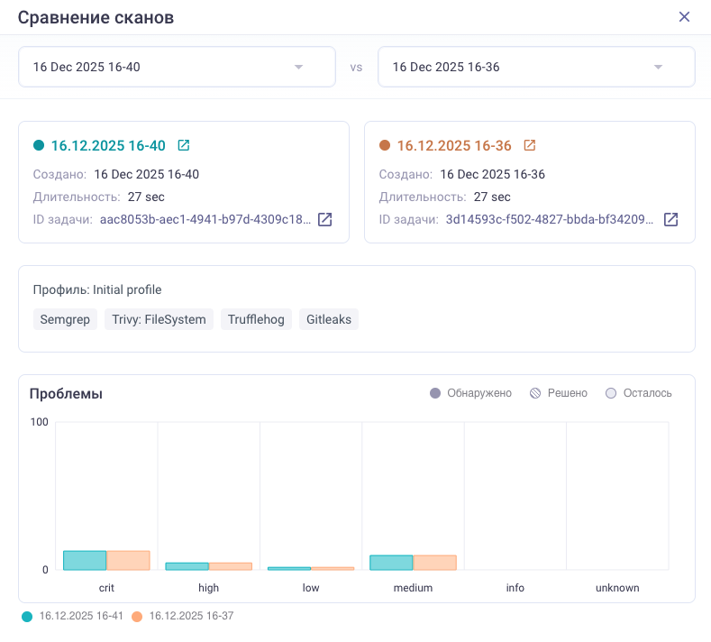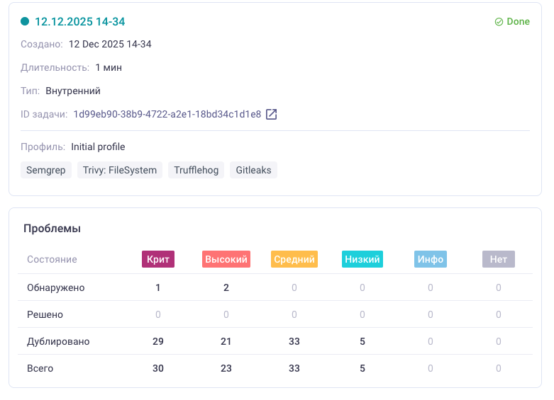 Пример: на скриншоте видим, что в рамках профиля было запущено 4 разных сканера. Например, Gitleaks по сравнению с Trufflehog нашел меньше уязвимостей и считает их менее критичными