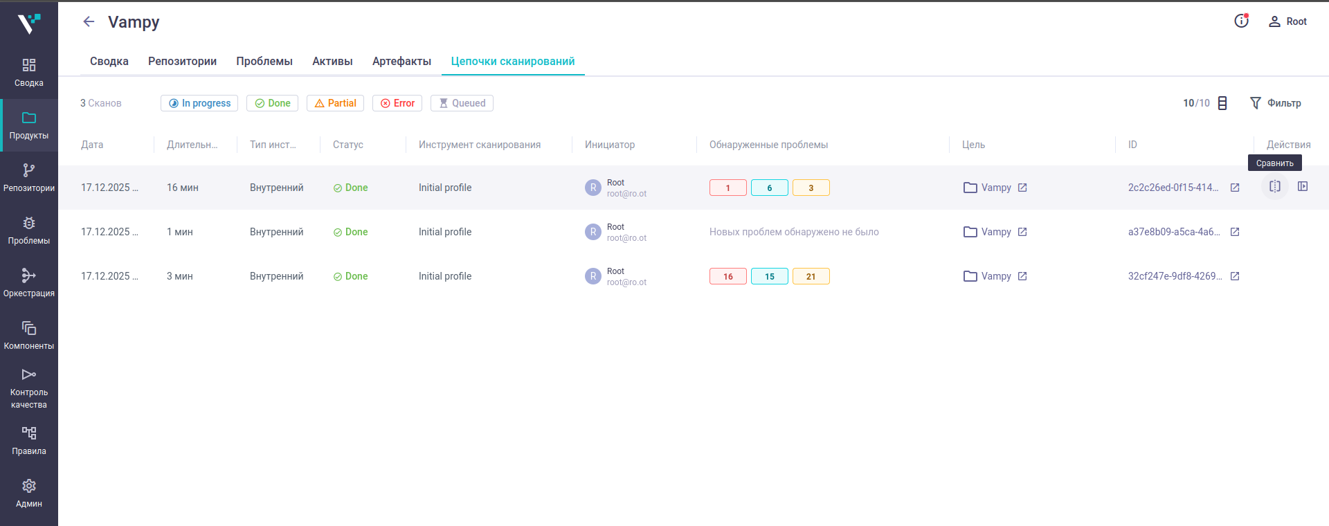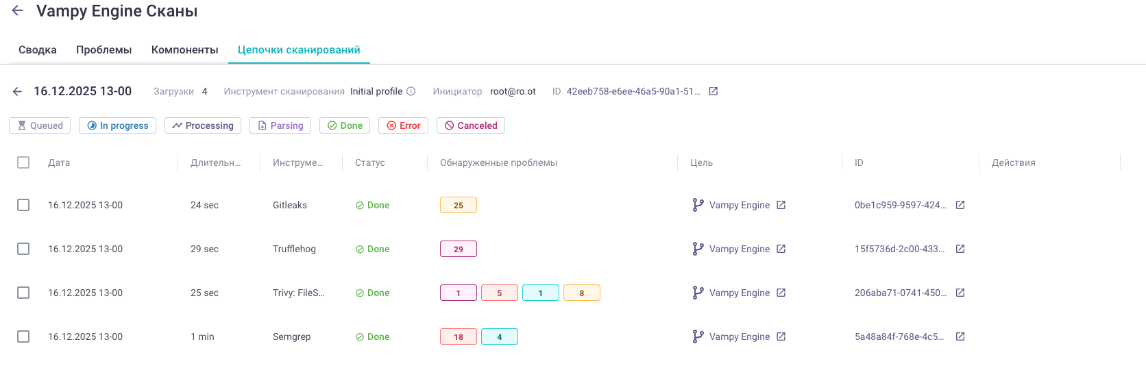 В "Репозиториях" и "Продуктах" есть раздел "Цепочки Сканирований" в котором представлена возможность для работы со сканированиями:
