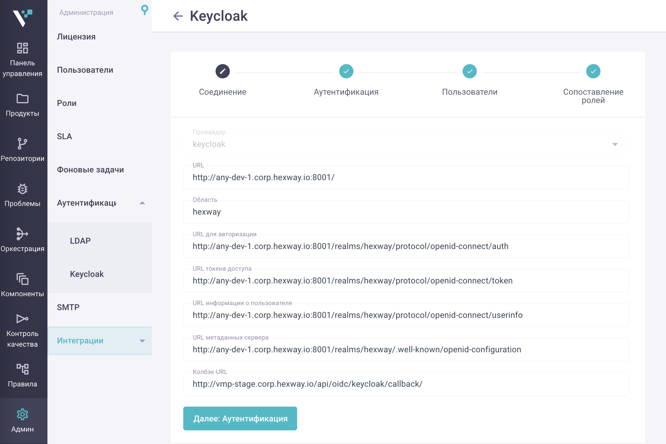 Для настройки интеграции с Keycloak перейдите в раздел Админ -> Аутентификация -> Keycloak