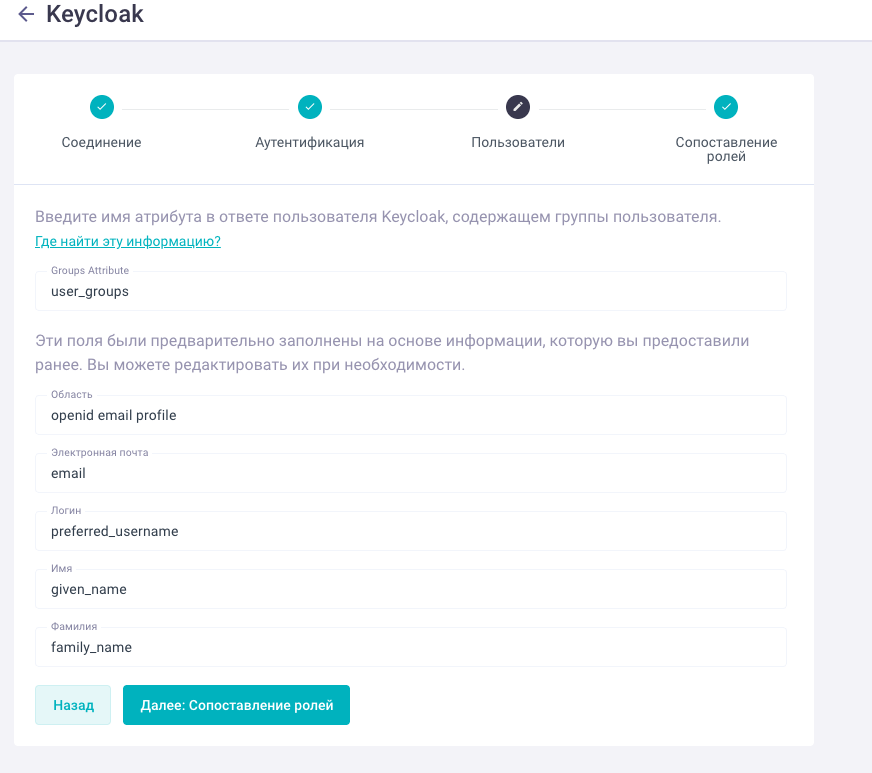 При интеграции важно убедиться, что Keycloak возвращает необходимые атрибуты пользователя: