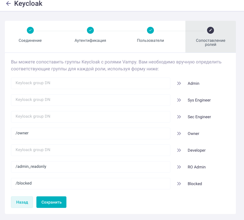 Настройте маппинг ролей в Vampy, чтобы роли Keycloak соответствовали ролям и уровням доступа в системе.
