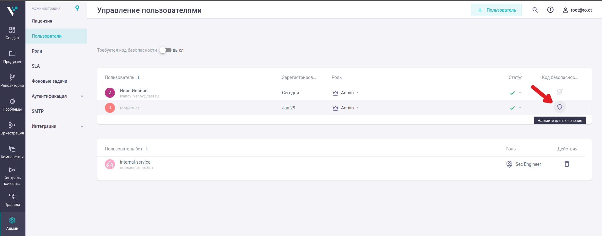 В строке пользователя нажмите на иконку в колонке Код безопасности.