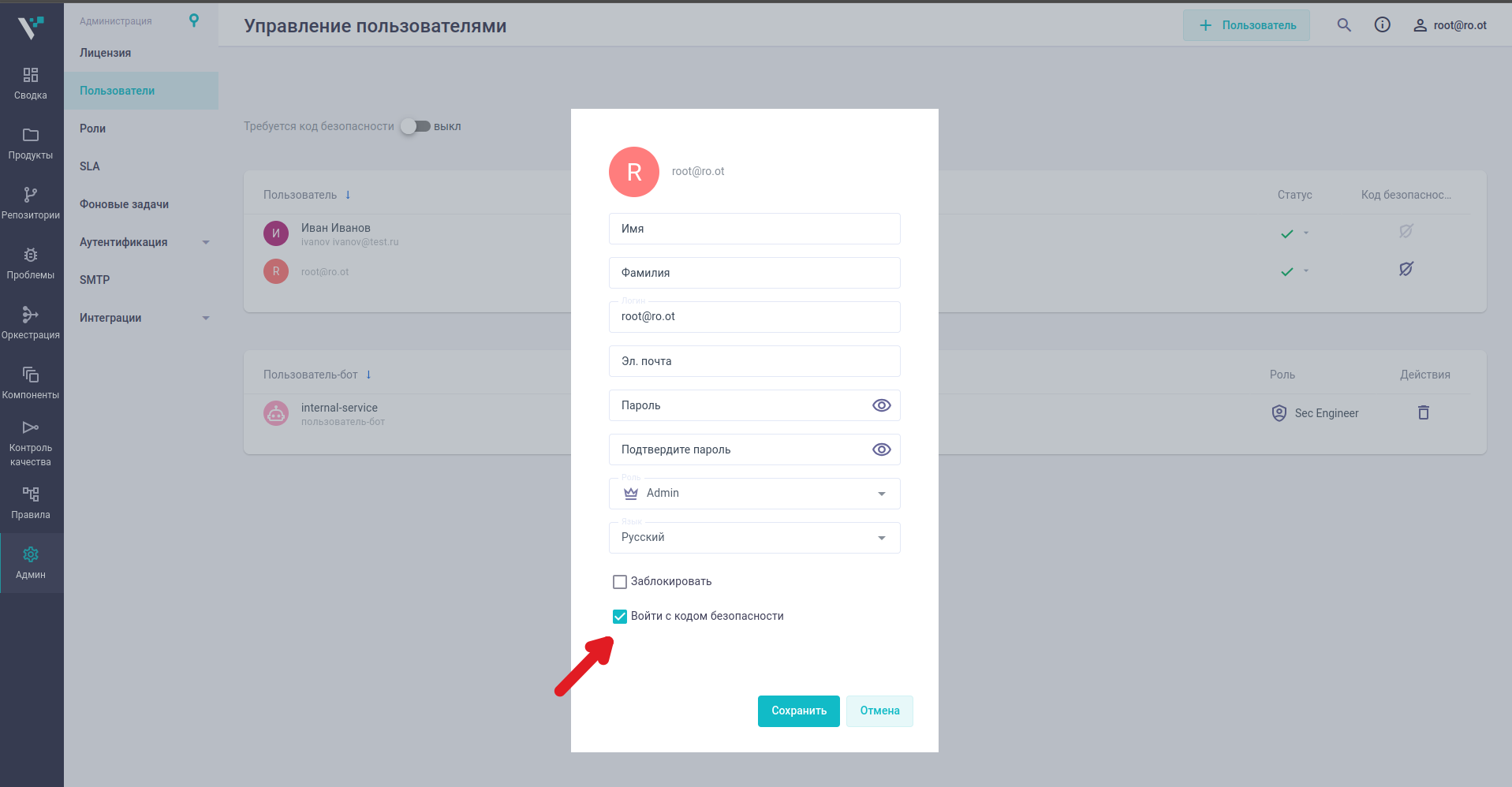 Альтернативно, можно открыть карточку пользователя и включить опцию Войти с кодом безопасности, затем нажать Сохранить.