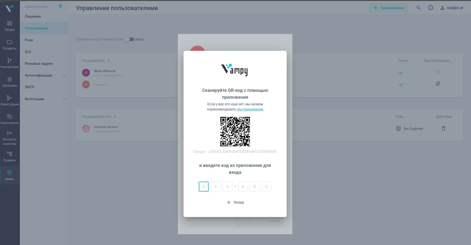 Платформа покажет QR-код и секрет для настройки приложения-аутентификатора. Отсканируйте QR-код в приложении-аутентификаторе и введите одноразовый код в форме подтверждения.